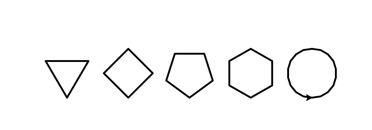 #turtle로 삼각형, 사각형, 오각형, 원 그리기 import turtle turtle.pensize(3) turtle.penup() turtle.goto(-200, -50) turtle.pendown() #circle을 이용하여 삼각형을 그린다. #반지름이 40인 3개의 점으로 원을 그리라는 뜻 turtle.circle(40, steps = 3) turtle.penup() turtle.goto(-100, -50) turtle.pendown() #circle을 이용하여 사각형을 그린다. #반지름이 40인 4개의 점으로 원을 그리라는 뜻 #같은 방법으로 5각형, 6각형도 그릴 수 있다. turtle.circle(40, steps = 4) turtle.penup() turtle.goto(0,-50) tu..
