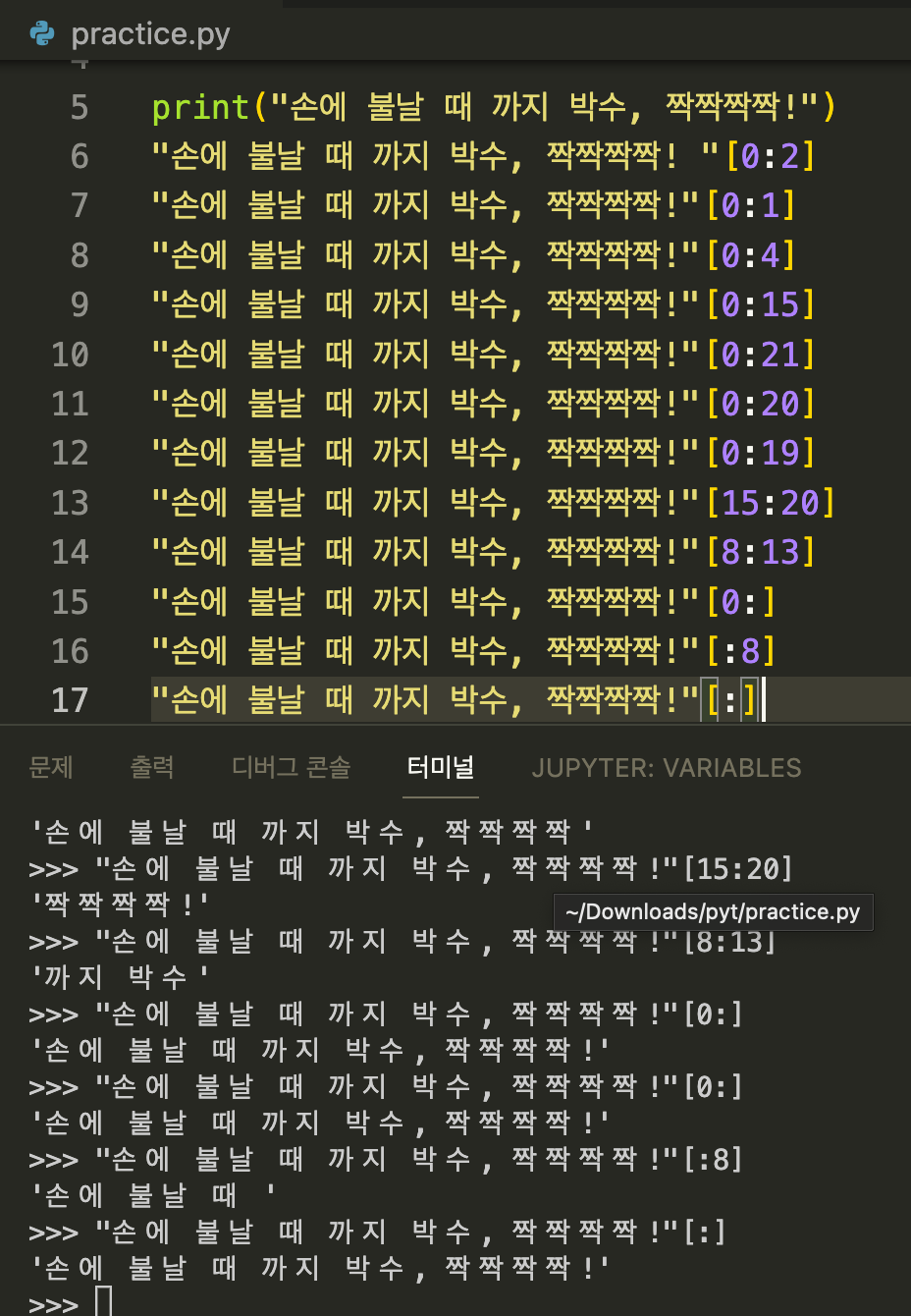 내가 준비한 문장 "손에 불날 때 까지 박수, 짝짝짝짝!" 은 길이가 총 19이다.