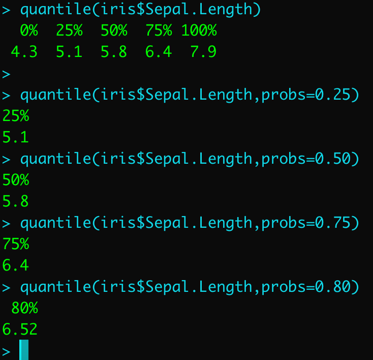 quantile() 함수를 이용하여 사분위수를 구해보자 (Sepal.Length만 사용)