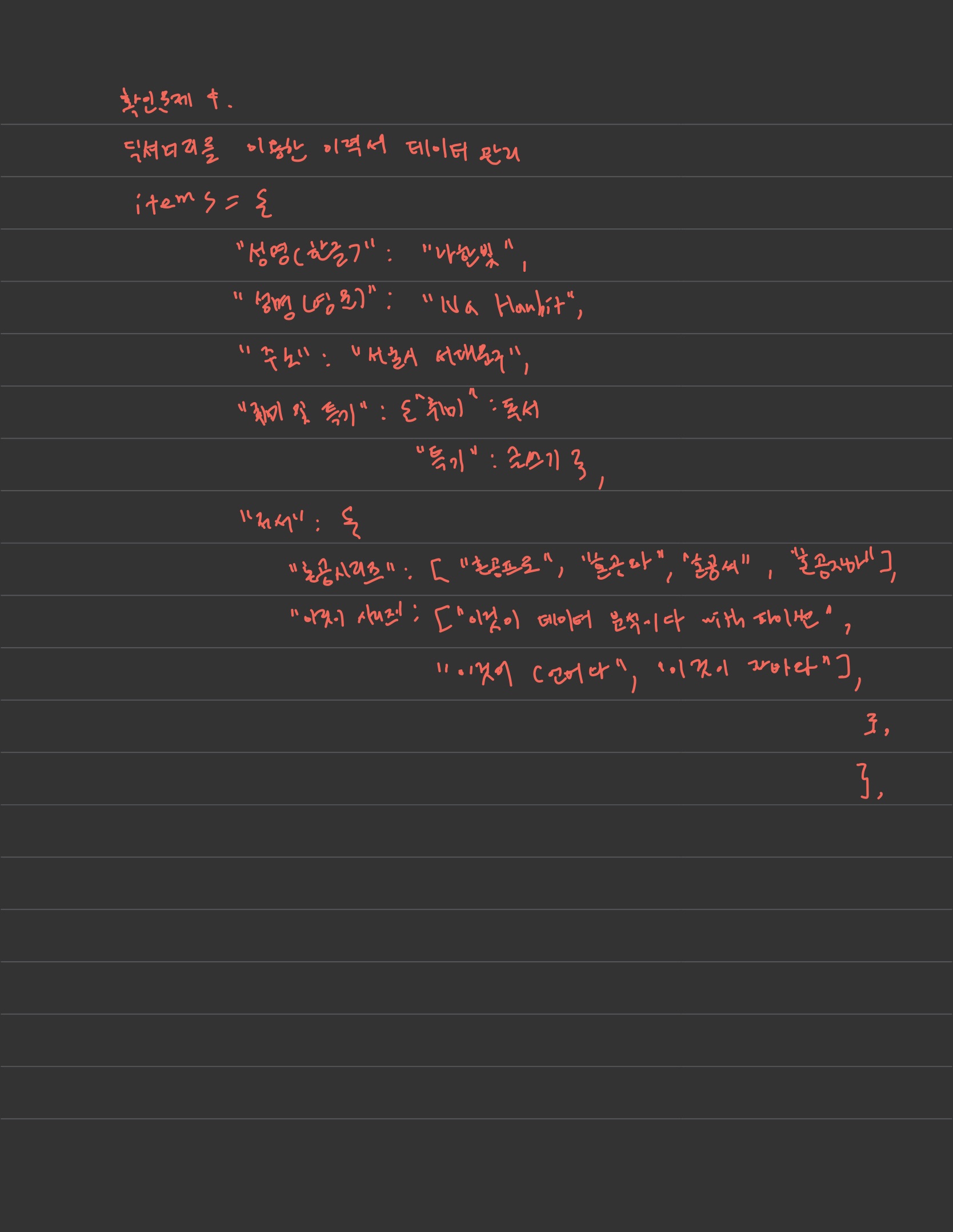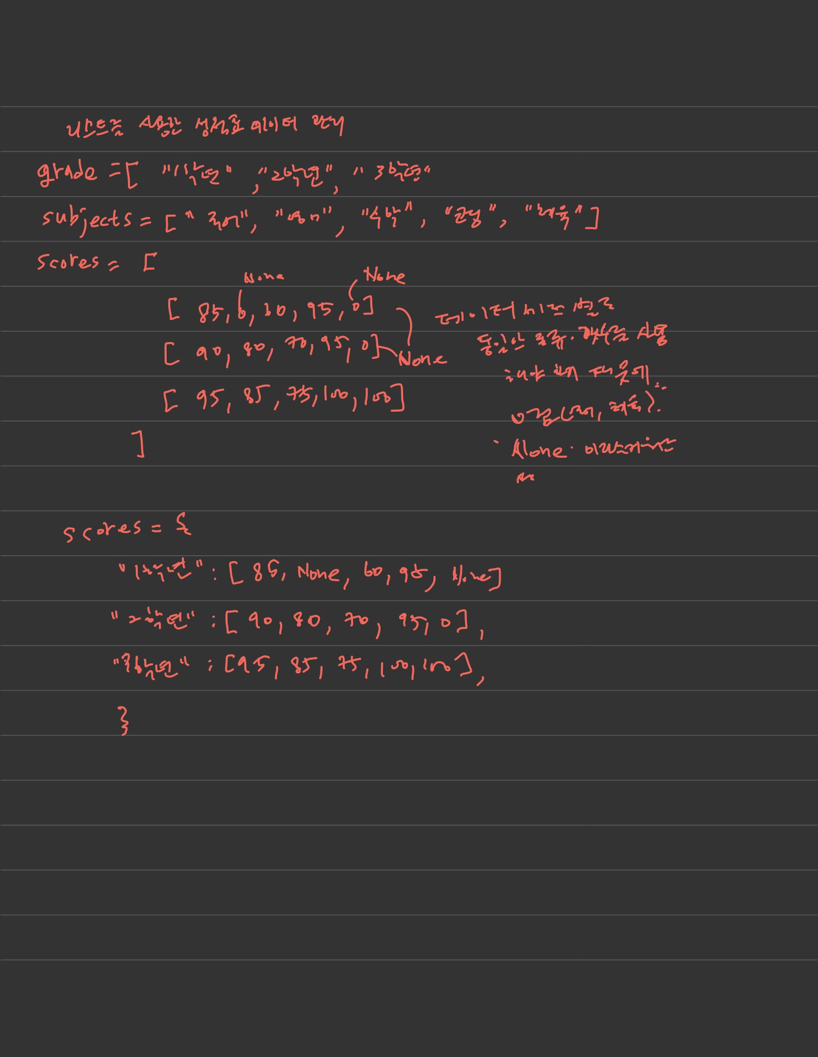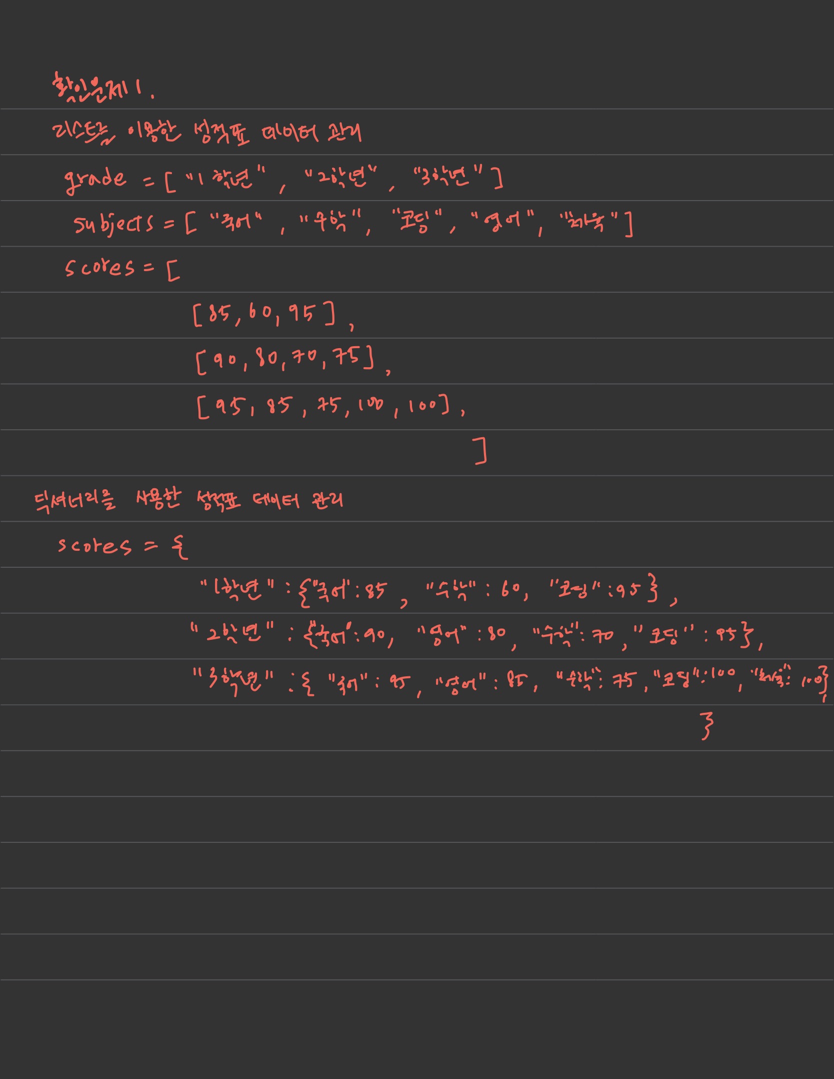 | 4주차 미션;변수, 리스트, 딕셔너리에 대해 이해한 내용을 본인만의 방식으로 정리한 후 포스팅하기. (0) | 2022.07.31 |