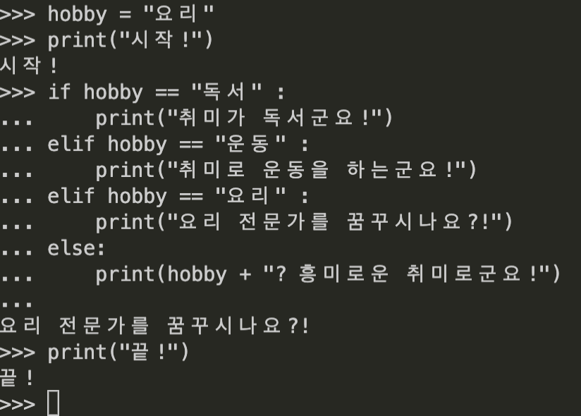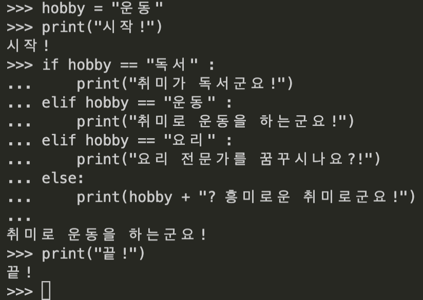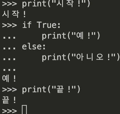 2. "시작"이 출력되고 if True로 시작했으므로 "예!"가 출력되고 마지막으로 "끝!"이 출력된다