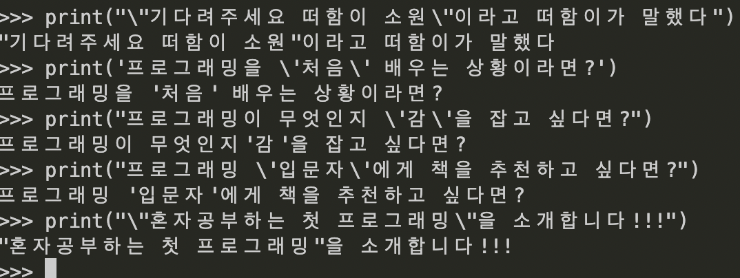 5. 따옴표를 그대로 출력하려면 큰 따옴표를 작은따옴표로 감싸거나 작은 따옴표를 큰 따옴표로 감싸면된다.
