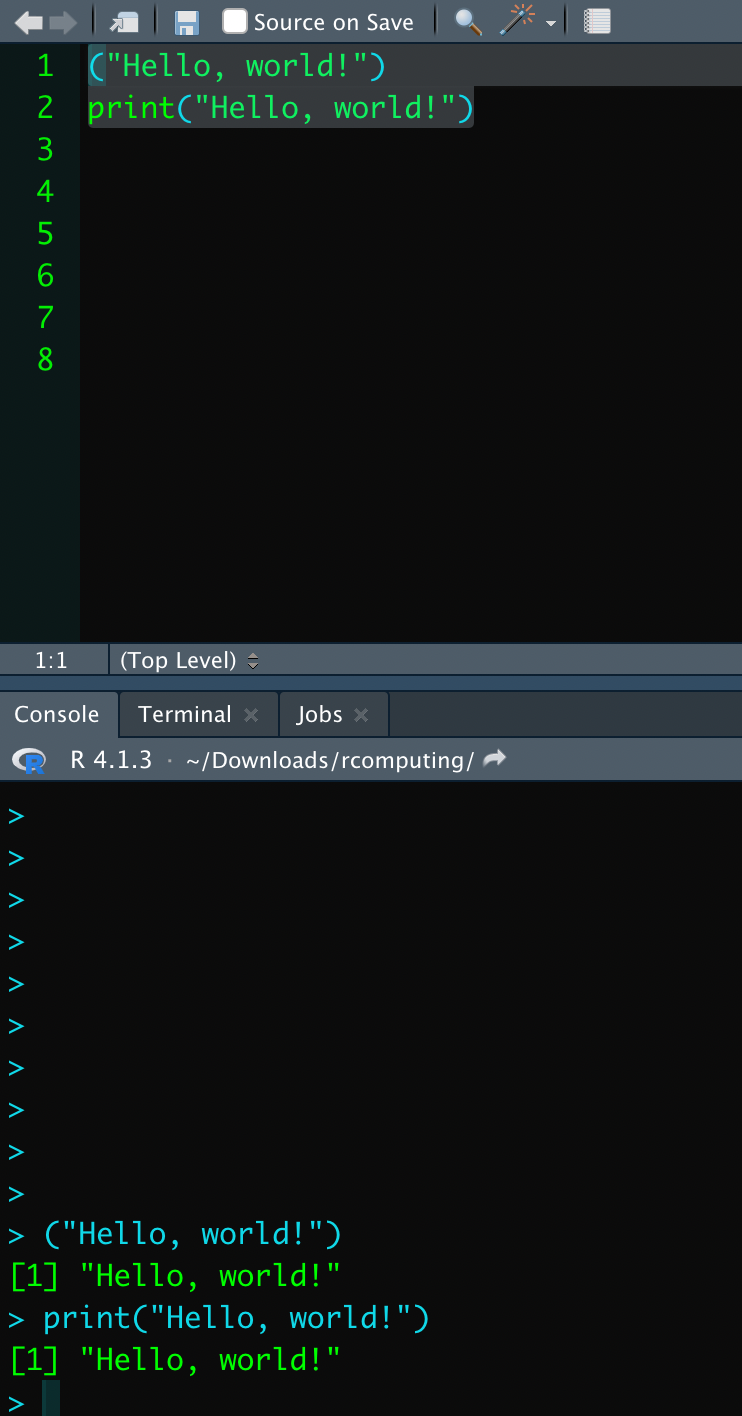 책에서는 print("Hello, world!") 라고 했지만 R에서는 그냥 ("Hello, world!") 만 해도 문자가 정상적으로 출력된다